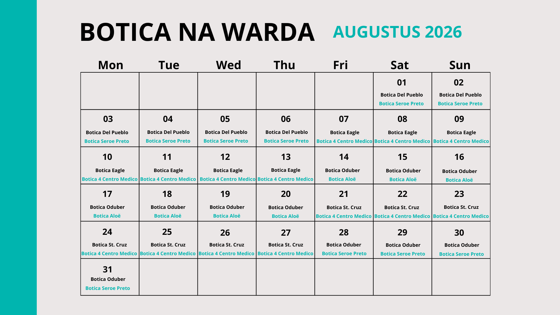 Augustus 2026 Botica na wardaDate: 1 August 2026 08:00 till 31 August 2026 20:00Location: ARUBA DOWNLOAD Share onShare this page on LinkedInShare this page on XShare this page on FacebookShare this page on WhatsAppShare the page 'Augustus 2026 ' via emailPrint this page