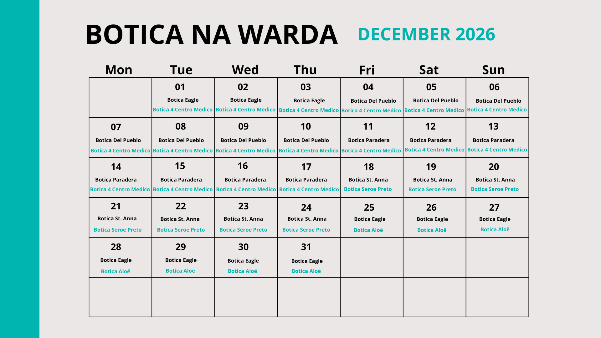 December 2026 Botica na wardaDate: 1 December 2026 08:00 till 31 December 2026 20:00Location: ARUBA DOWNLOAD Share onShare this page on LinkedInShare this page on XShare this page on FacebookShare this page on WhatsAppShare the page 'December 2026 ' via emailPrint this page