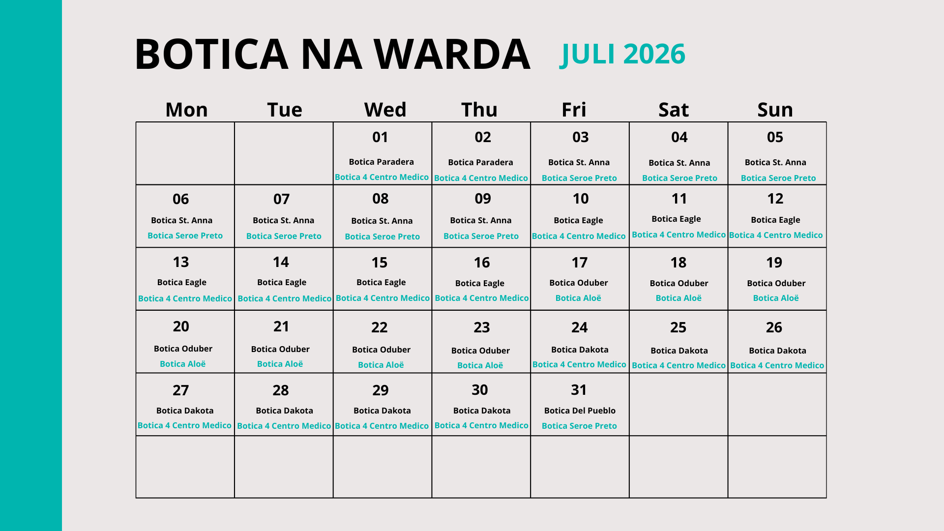 Juli 2026Botica na wardaDate: 1 July 2026 08:00 till 31 July 2026 20:00Location: ARUBA DOWNLOAD Share onShare this page on LinkedInShare this page on XShare this page on FacebookShare this page on WhatsAppShare the page 'Juli 2026' via emailPrint this page
